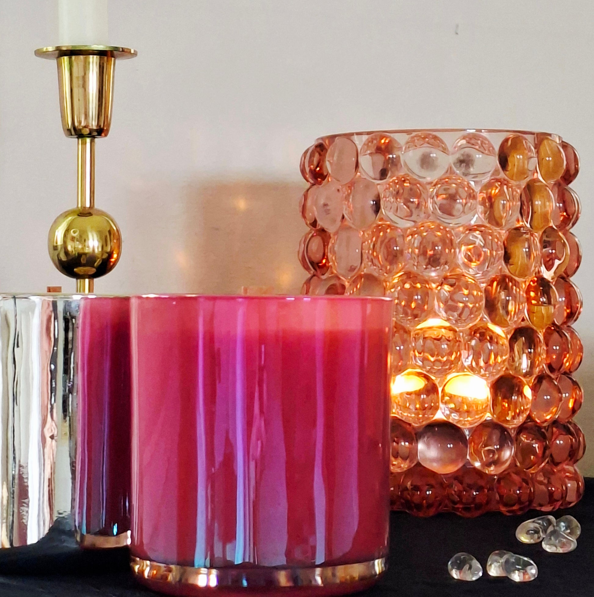 Den stilrena, rosa glasformen har en fluorescerande effekt och blir ett vackert objekt i inredningen och passar mycket bra färgmässigt med både guld, silver, svart och vitt. Använd glasformen som ljuslykta med värmeljus efter att ditt doftljus brunnit klart - det blir superfint!