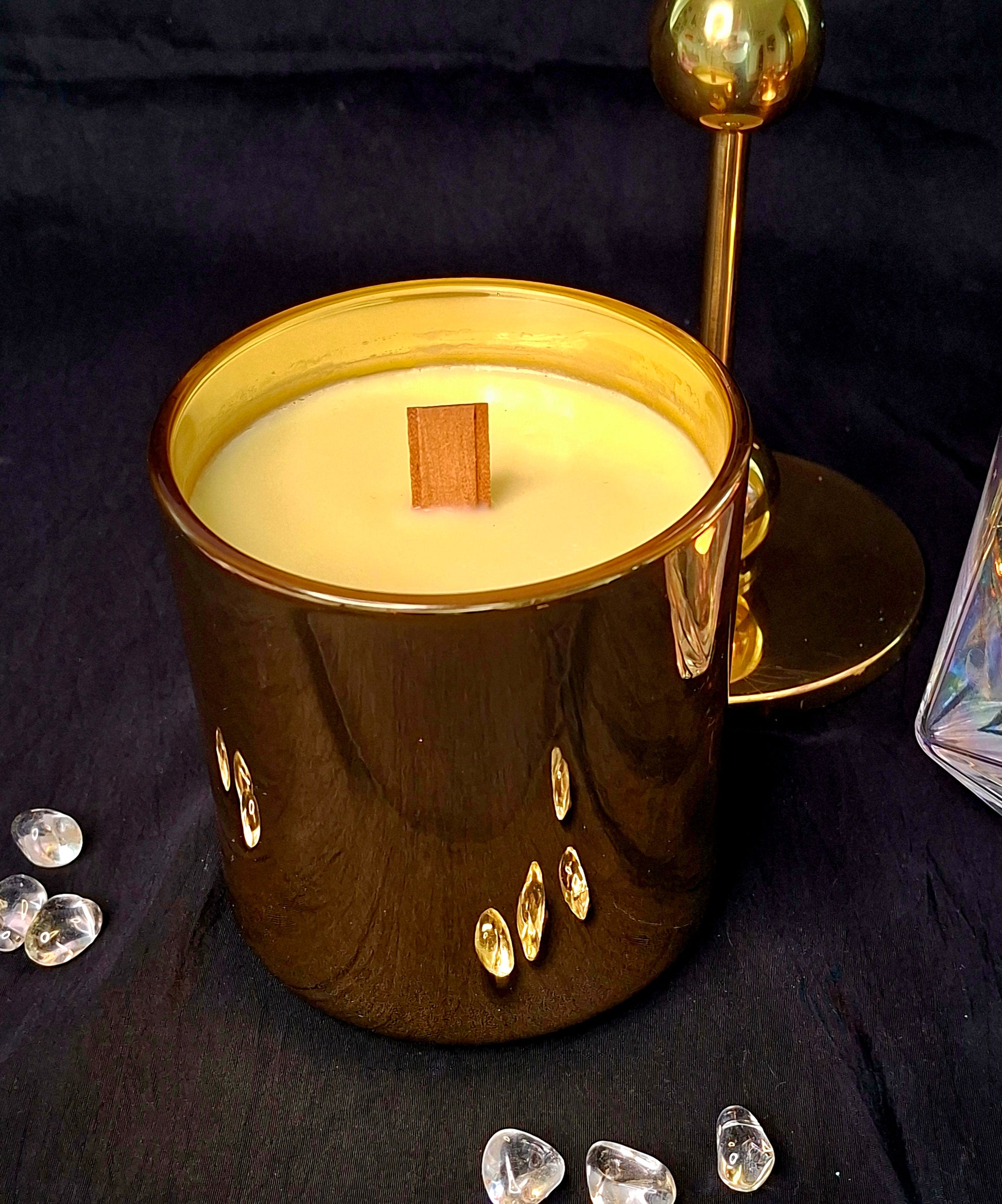 Golden moments! Glasform i guld ca 50cl och 30cl. Brinntid ca 45h resp 60 h. Träveke. Vikt ca 480g resp 860g.
